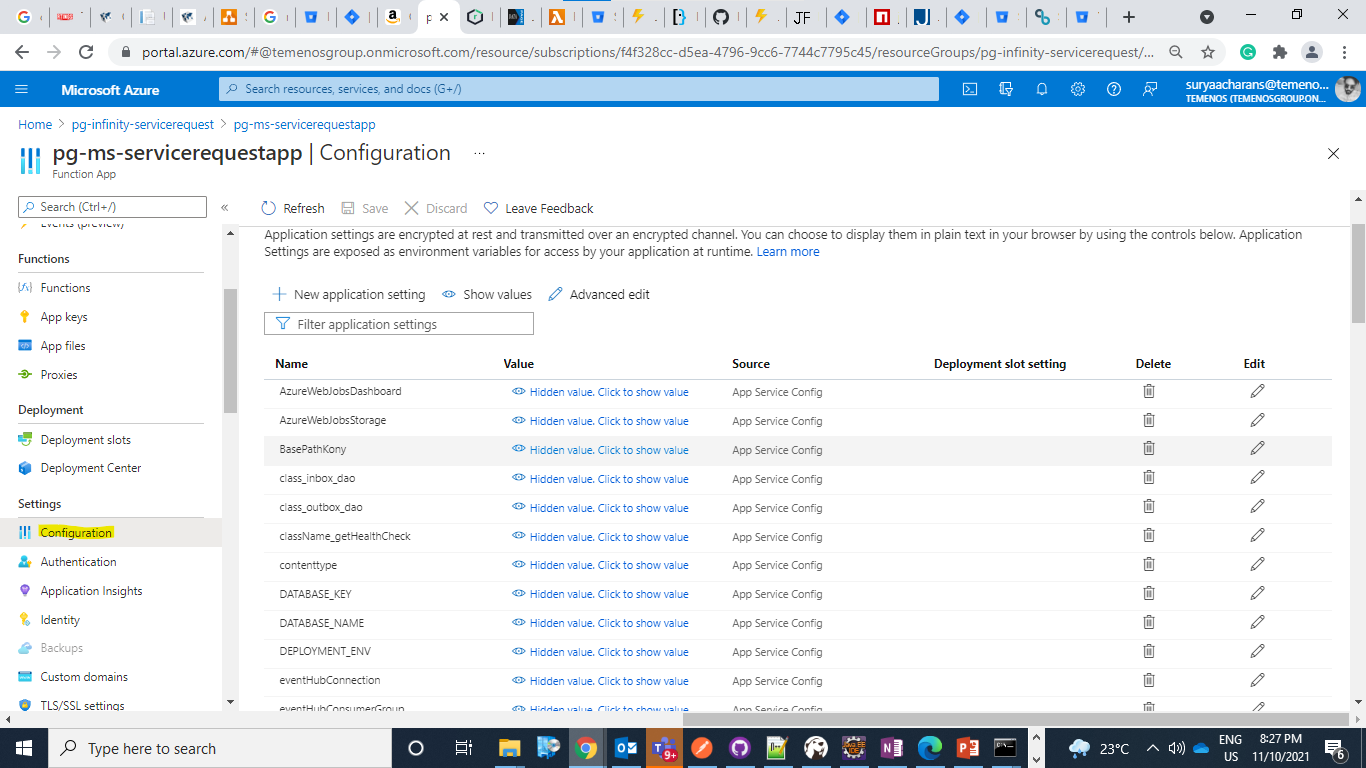 Azure properties can be validated based on the database against the sample values mentioned in Service-Request Azure Configuration.During the service request deployment, the user can find the configuration tab in the service request function app.