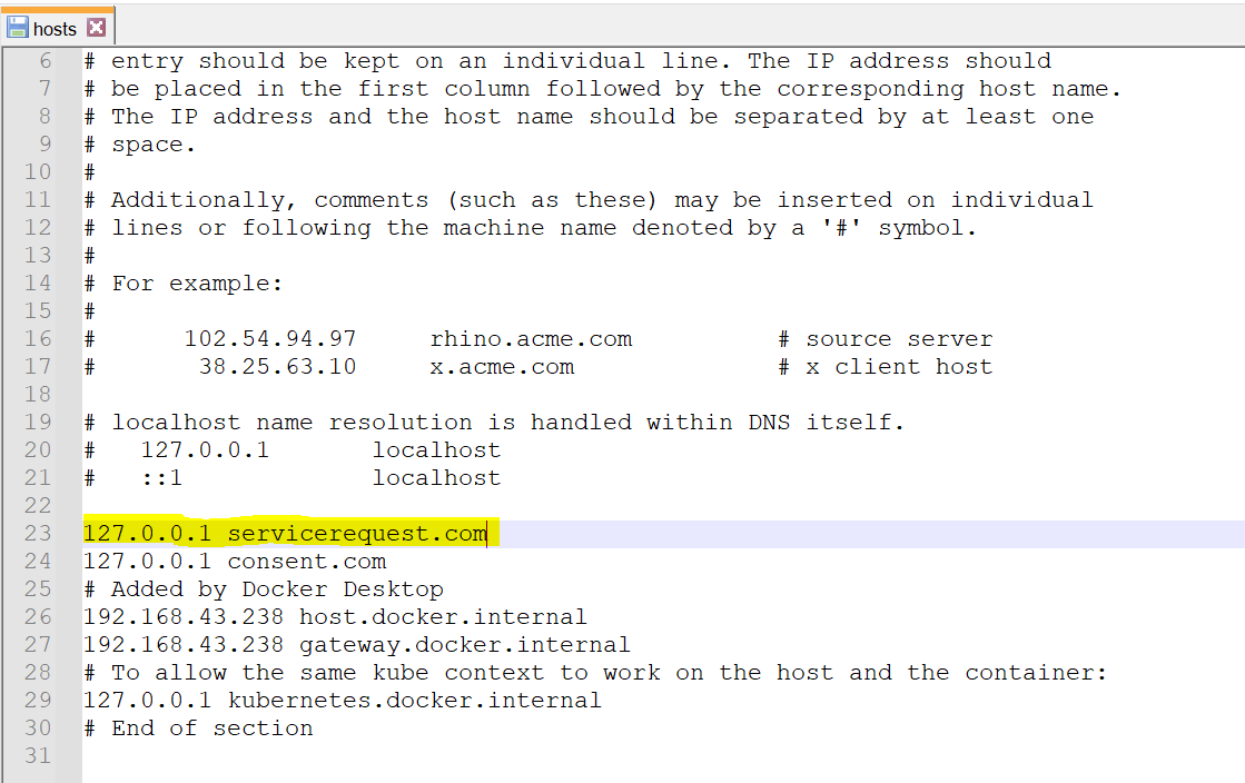 - Navigate to C:\Windows\System32\drivers\etc and set the domain name ("127.0.0.1 servicerequest.com") in the hosts file of Windows and then restart the machine/server to reflect the changes.