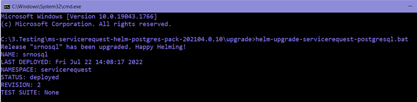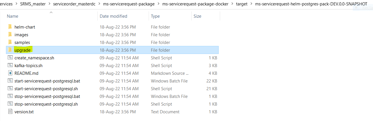 - To upgrade an existing helm chart, navigate (ms-servicerequest-package\ms-servicerequest-package-docker\target\ms-servicerequest-helm-postgres-pack-DEV.0.0-SNAPSHOT\upgrade) to the upgrade folder in the root helm package.