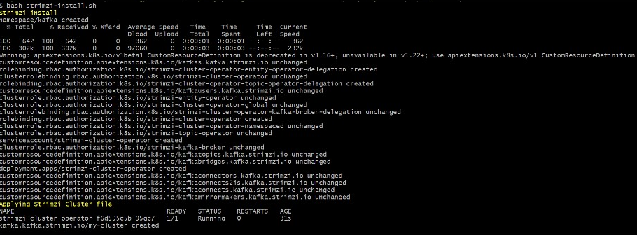 If Strimzi is not installed in the machine, navigate into the streams folder and run ./strimzi-install.sh. This is a one-time step and must be repeated if we reset our Kubernetes cluster. For more information, refer to Service-Request K8 : Setting Up Kafka using Strimzi