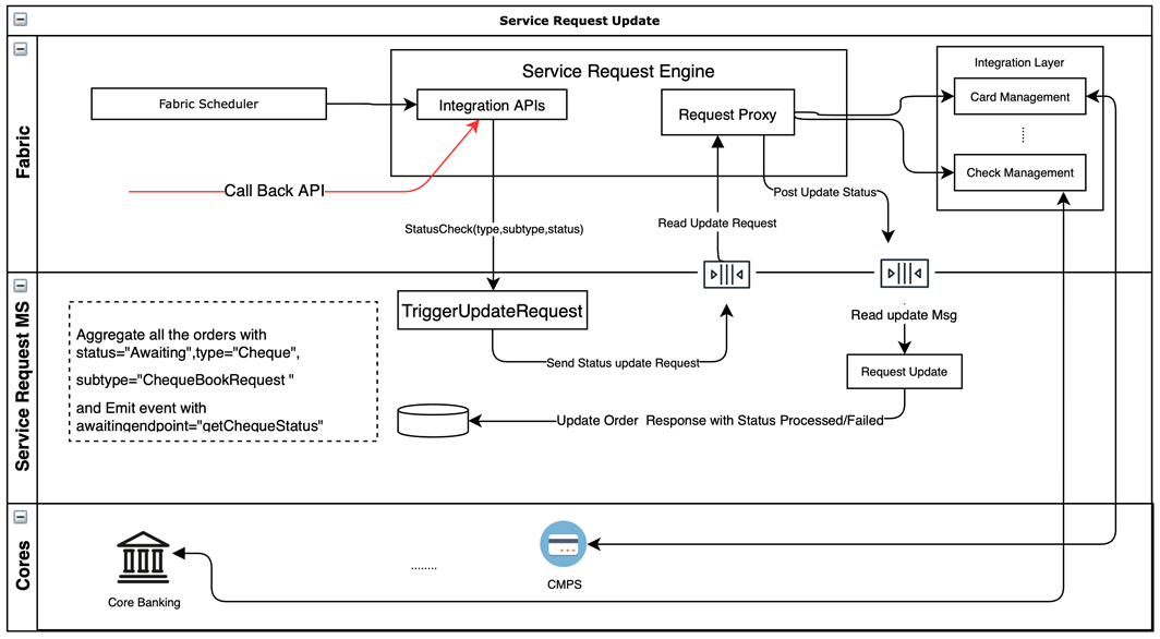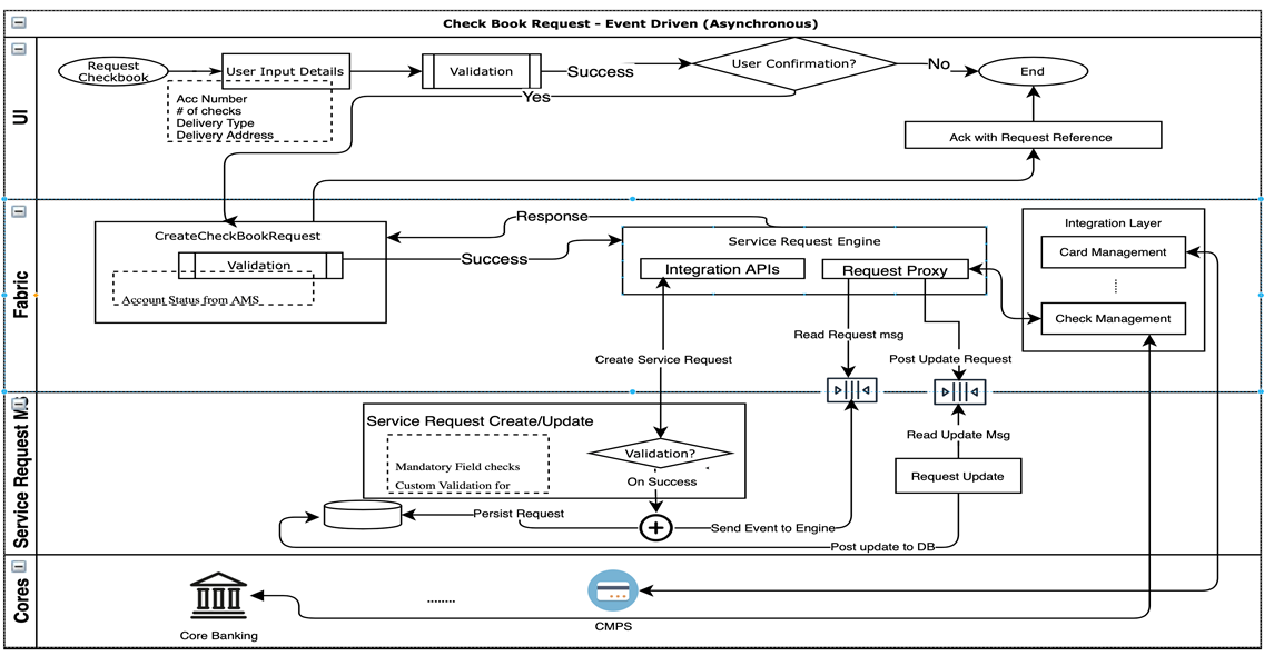 - Near-Time: This is the asynchronous way of processing a request, where the user submits a service request from Online Banking, the order is captured in the Service Request Microservice. The acknowledgment that is shown to the user is based on the response from the Service Request Microservice. Subsequently, the request is passed to the core system for processing. The upcoming request status is updated to the user based on the response from the core system. It is a standard success/error response that provides confirmation about the request , which is a backend process.