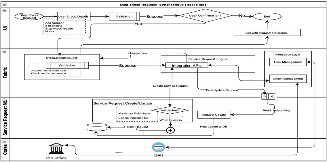 - Real-Time: This is the synchronous way (waits for the response) of processing a request, where the user submits a Service Request from Online Banking, the order is captured in Service Request Microservice and is instantly processed by the core system. The acknowledgment that is shown to the user is based on the response from the core system and the Service Request Microservice.