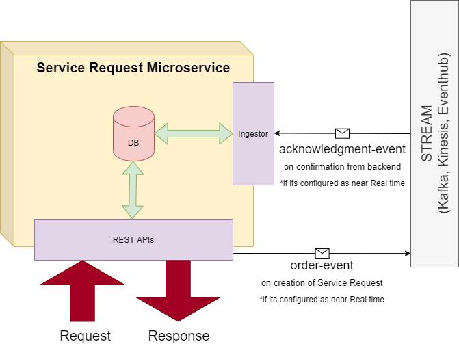 This process use streams/messaging queues namely Kafka, Kinesis, and EventHubs. When a request is created the Microservice produces a message into a particular configured topic (OOTB, its order-event) which is used for processing. The Microservice can also receive messages in a standard expected format to update a Service Request post-processing by the backend system in a particular configured topic (OOTB, its acknowledgment-event) which is validated and is used to update the record in DB.