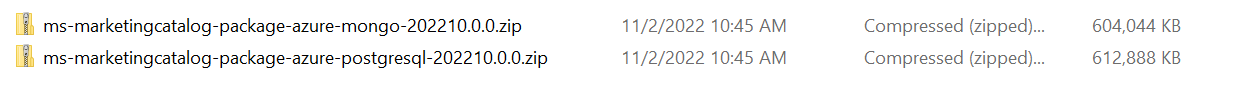 This section shows the folder structure of Marketing Catalog package. Marketing-Catalog Microservices for Azure deployment is available as release bundles with respect to databases as ms-marketingcatalog -package-azure-mongo<release_number>.zip and ms-marketingcatalog -package-azure-postgresql<release_number>.zip .