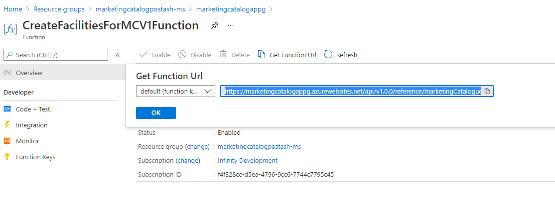 1. The Get Function URL will provide the complete URL with API key.