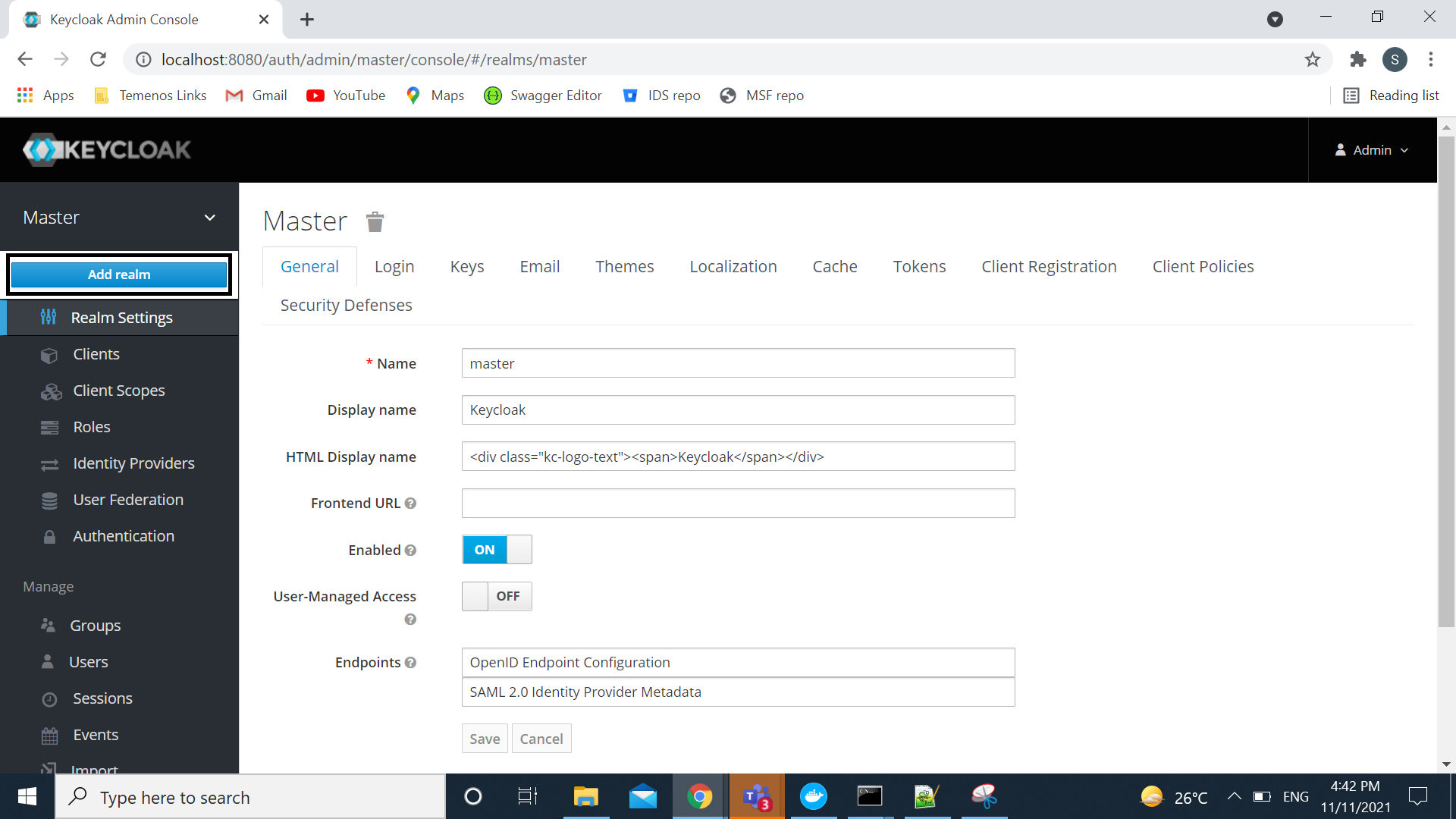 1. In KeyCloak web application (http://localhost:8080/auth/), login to the admin console with the created user name and password (admin/admin).