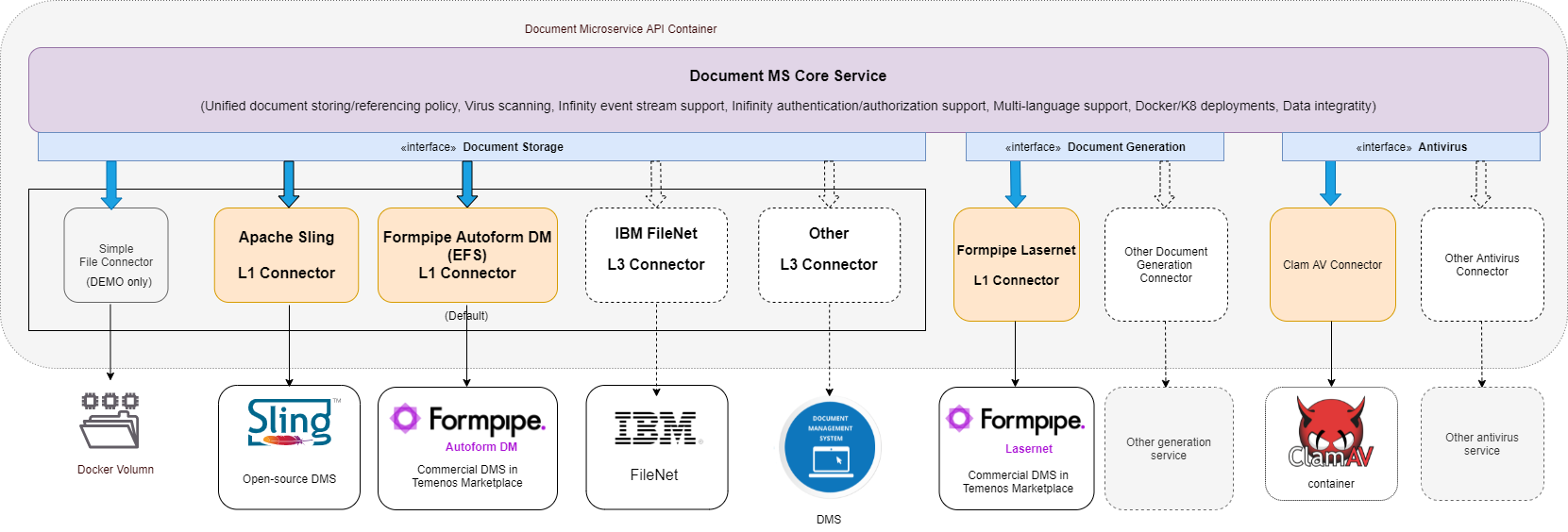 Document Microservice doesn't store documents within, rather, it acts as a proxy service that relies on the external DMS (Document Management System) to store the actual files. It connects Formpipe products (Autoform DM and Lasernet) to generate and store the documents, which is out of the box. Clients need to purchase the commercial license from Formpipe before using this microservice. Alternatively, clients can choose their preferred DMS and document generation product, which would require L3 customization.