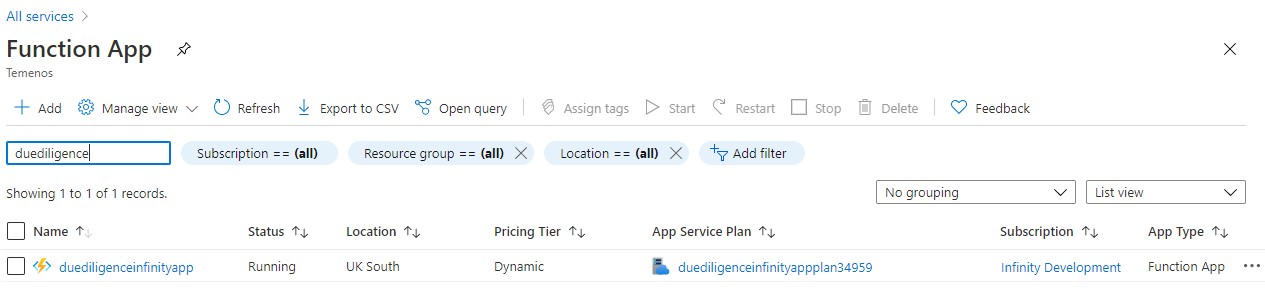 5. You can change the default Azure function app name in the script. In case of app name changes, rename the app available under (ms-duediligence-azure\target\azure-functions\<app folder>\) .