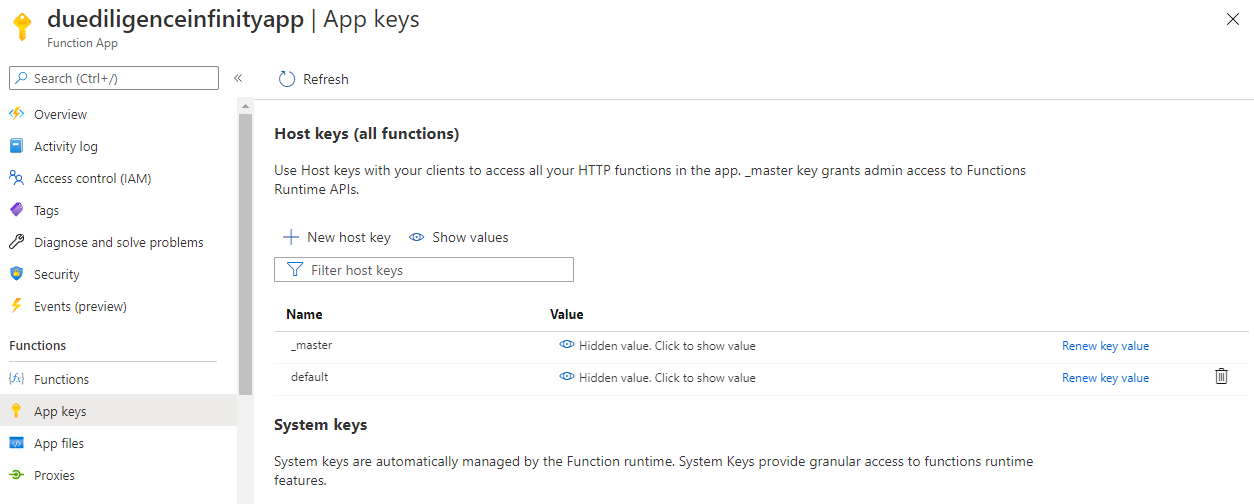 You can retrieve the API key for each endpoint in the function app using the command below: