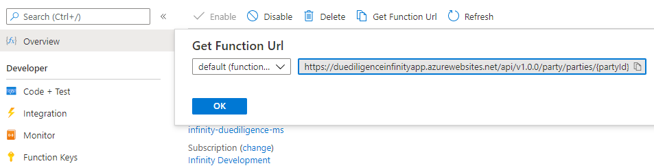 4. You can change the default Azure function app name in the script. In case of app name changes, rename the app available under (ms-duediligence-azure\target\azure-functions\<app folder>\) .