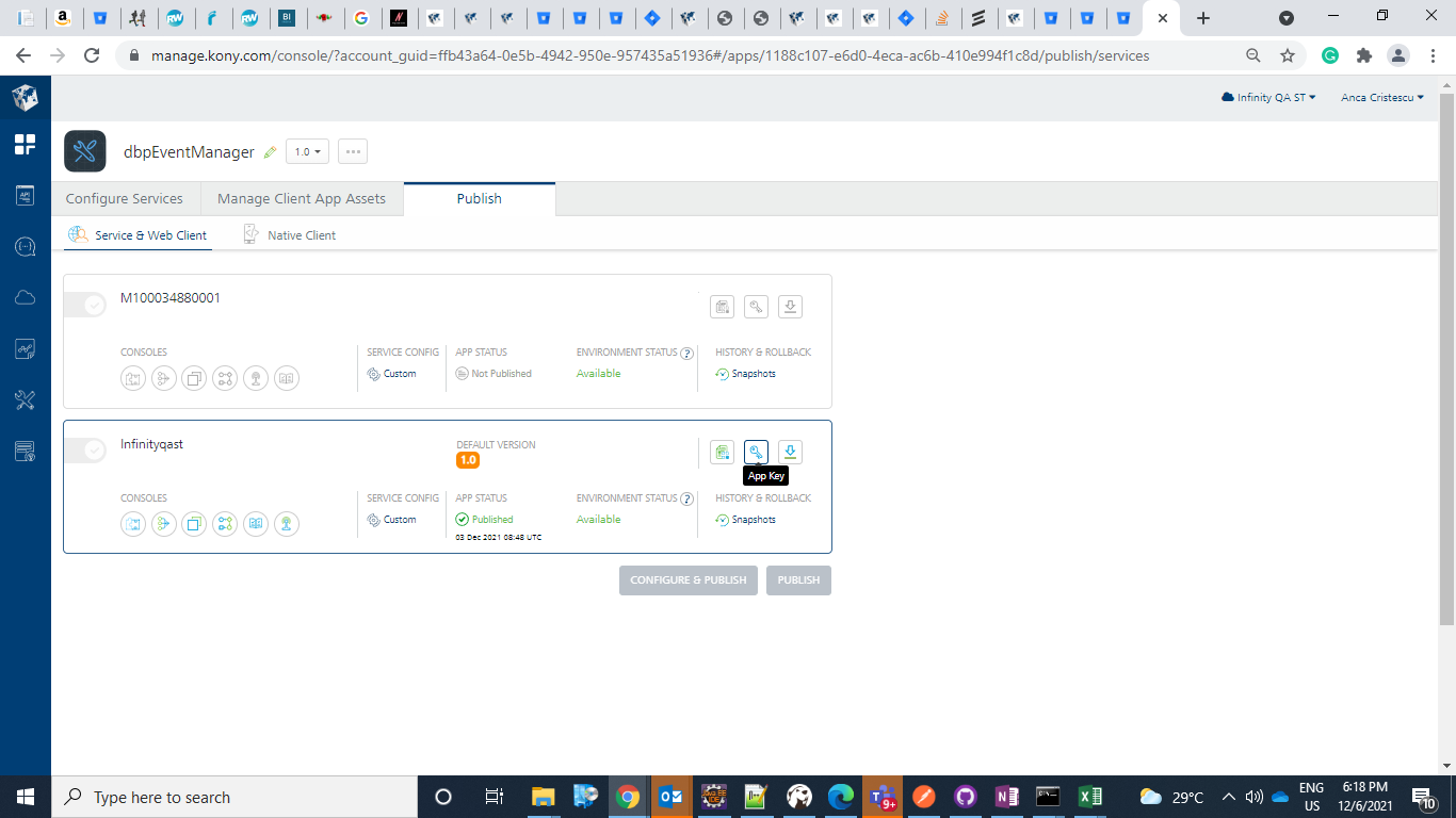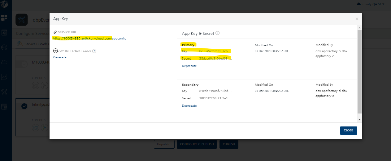 The XKonyAppKey, and XKonyAppSecret can be retrieved from fabric MF console. The dbpEventManager contains the userStore Identity service, and PushExternalEvents Object Service, where you can view for the PushExternalEvents Object service in API management console and find associated apps.