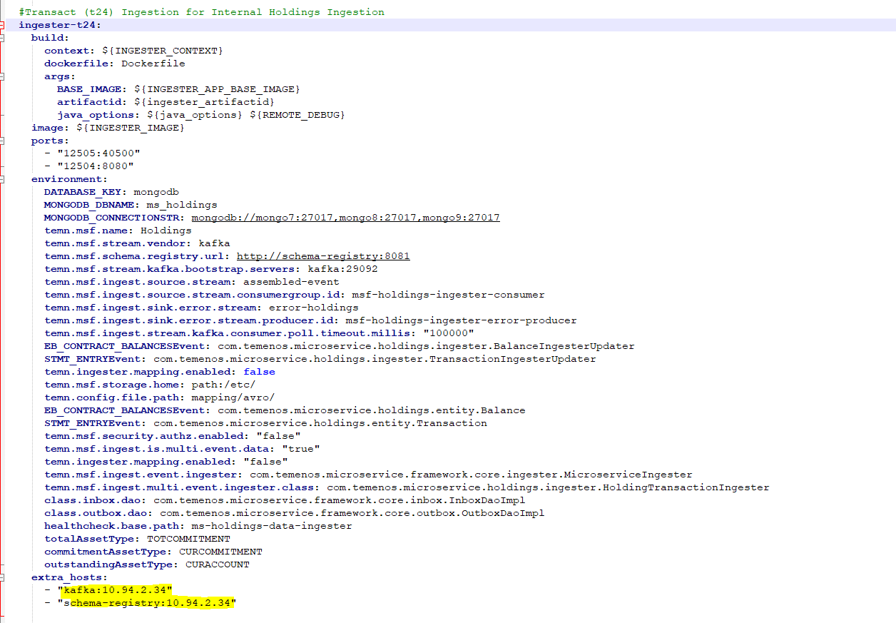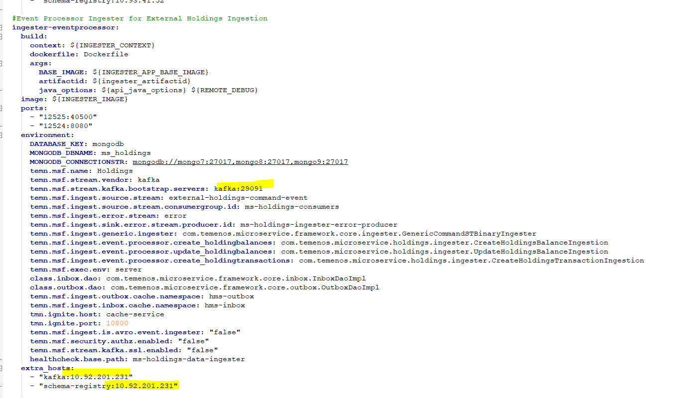 - For Event Processor External Ingestion, Change the IP and Kafka where Standalone Kafka is running in the holdingsMongo.yml and holdingsPostgresql.yml as follows: