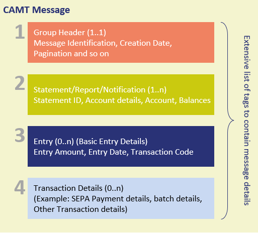 CAMT message has a nested structure with multiple building blocks. It can contain account-specific reports, notifications, and statements depending on the message type. It contains atleast one report.