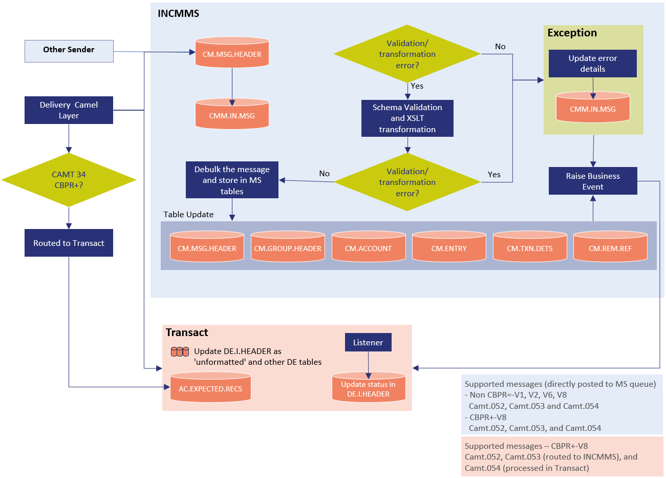 - Transform different versions of CAMT message to a generic XML using XSLT De-bulk message and store it in different tables.