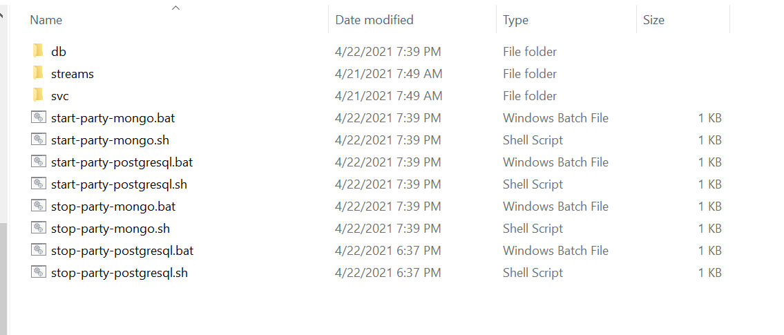 start-party-postgresql.bat / start-party-postgresql.shThe script deploys the necessary components for a microservice. It includes the deployment of the streaming services to run the Microservice independently.