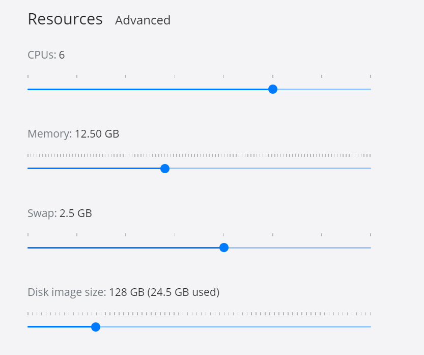 2. Kubernetes requires a minimum of six CPUs to run smoothly. Go to Docker settings → Resources, and increase the CPU and Memory as shown here.