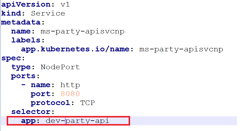 7. For Nodeport service deployment, append the same environment-specific deployment variable in party-nodeport.yaml.