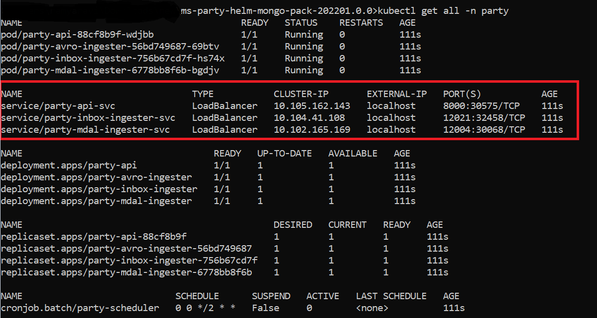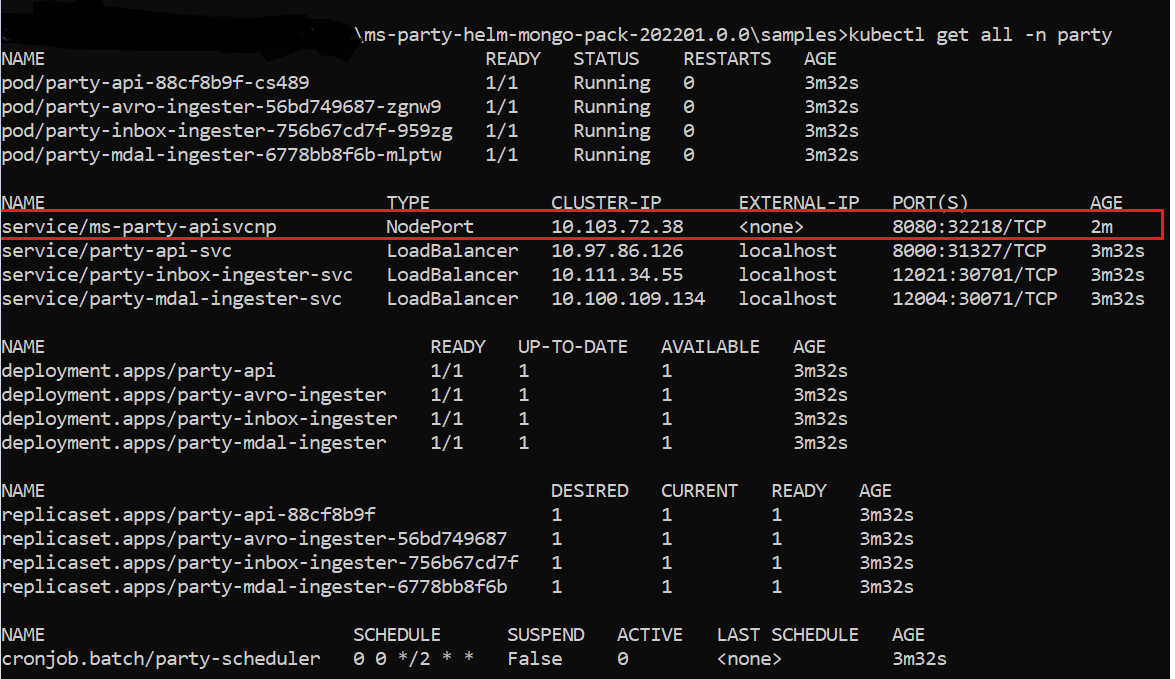 After the successful K8 deployment, execute the kubectl get all -n party (namespace) command