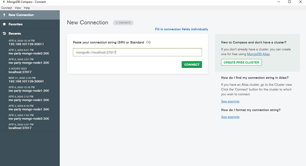 - Connect the MongoDB Compass to the MongoDB server by using the following URL: