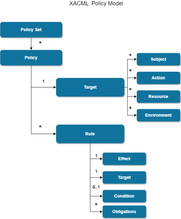 XACML (Extensible Access Control Markup Language) is an open standardised XML-based language for configuring security policies and access rights for Web services. The following figure shows a simplified XACML policy model. XACML supports fine-grained, attribute-based access control definitions and supports policy composition by reusing these low-level definitions.