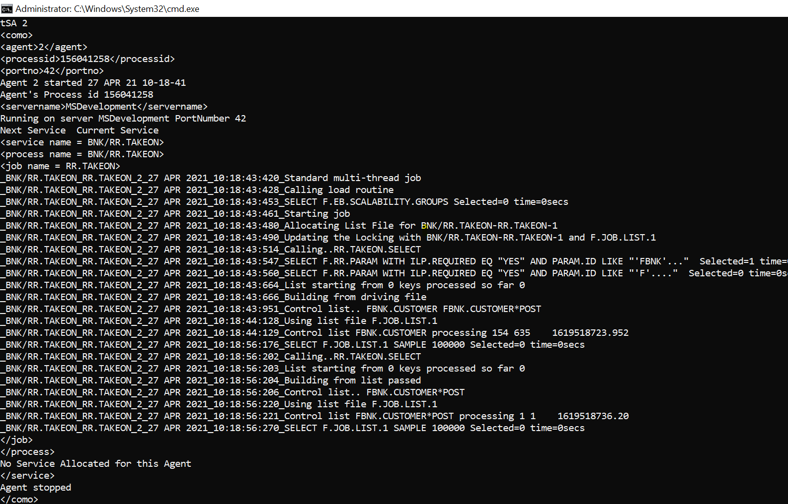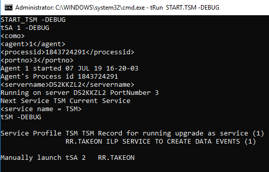 5. Launch the agent allocated for the BNK/RR.TAKEON service by using the commane tRun tSA <AgentNumber>.