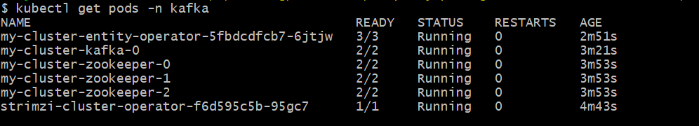 - Execute kubectl get pods -n kafka in order to check all pods are up and running.