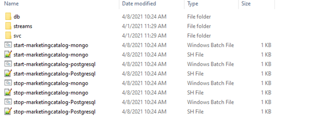 | start-marketingcatalog-mongo.bat / start-marketingcatalog-mongo.sh | To deploy all the necessary components for a Microservice including streaming services will be deployed, in order to run the Microservice independently. |