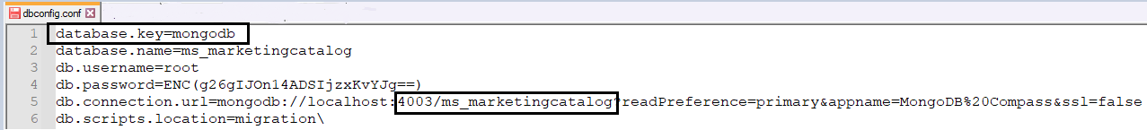 Copy the mongodb-0 port number from mongo_services.yaml (\..\ms-marketingcatalog-docker\k8\on- premise\db\database\mongo\rs) and replace the port number in dbconfig.conf (\..\ms-marketingcatalog-docker\dbMigration\config).