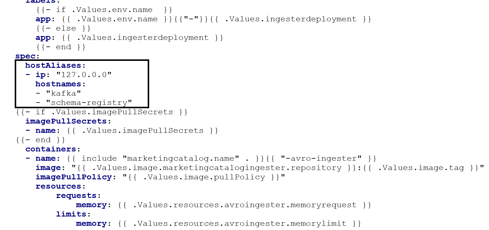 - Update host aliases with DES IP for Kafka and Schema registry in marketingcatalog-ingester.yml.