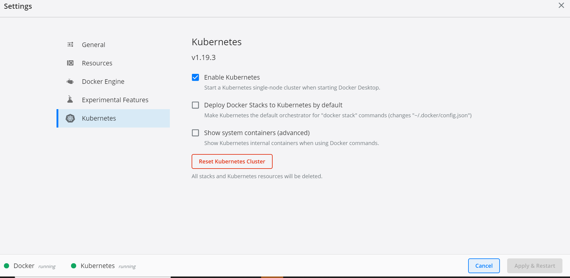 - After the Docker is installed, enable Kubernetes in the Docker Desktop app.