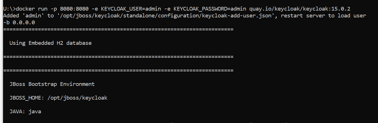 docker run -p 8080:8080 -e KEYCLOAK_USER=admin -e KEYCLOAK_PASSWORD=admin quay.io/keycloak/keycloak:15.0.2