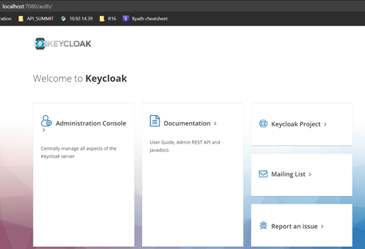 - In KeyCloak web application (http://localhost:8080/auth/), login to the admin console with the created user name and password (admin/admin).
