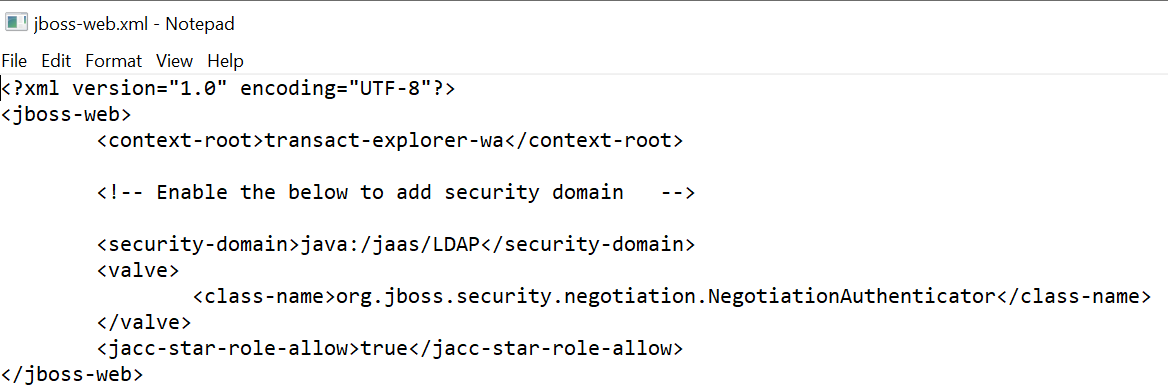 Navigate to transact-explorer-wa.war\WEB-INF\jboss-web.xml file and configure the below security domain details.
