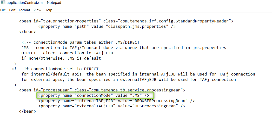 - Open the tb-server.war\WEB-INF\classes\applicationContext.xml file and update the value of the ConnectionMode property name as JMS. The default value is Direct.