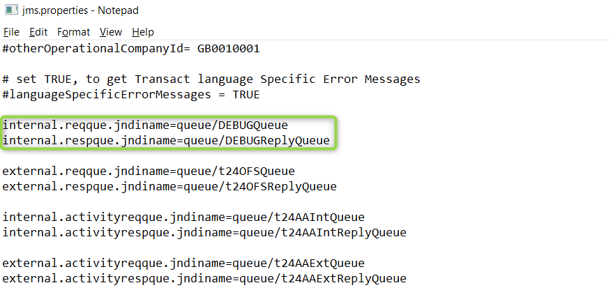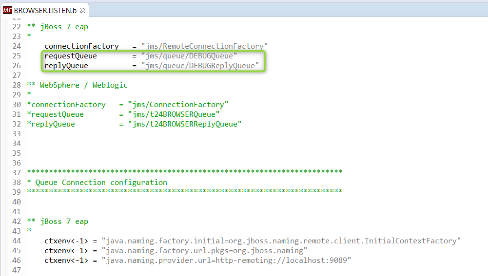 - Configure the queues (DEBUGQueue and DEBUGReplyQueue) in Temenos\jboss\standalone\configuration\standalone-utp.xml