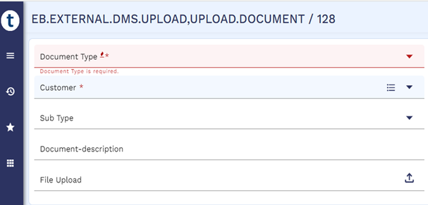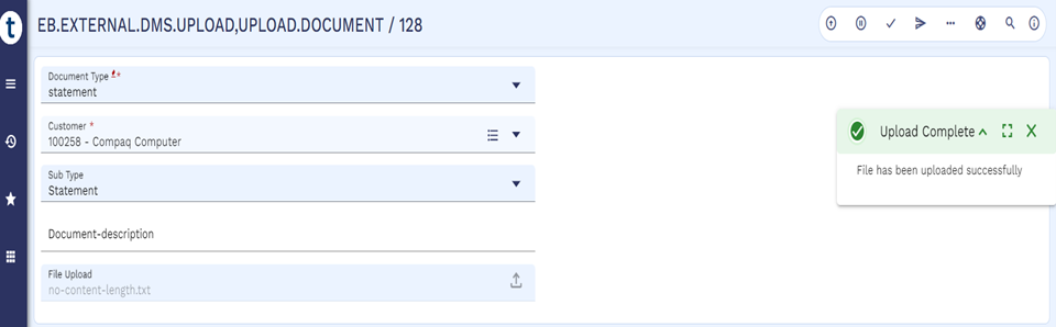 - Upload documents specific to that type in VERSION I EB.EXTERNAL.DMS.UPLOAD,CUSTOMER.IMAGE.