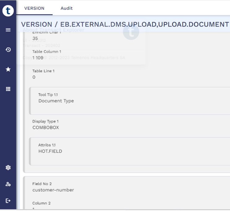 - Create a version (VERSION I EB.EXTERNAL.DMS.UPLOAD,UPLOAD.DOCUMENT) based on the new application and define document type as hot field where the validation occurs automatically.